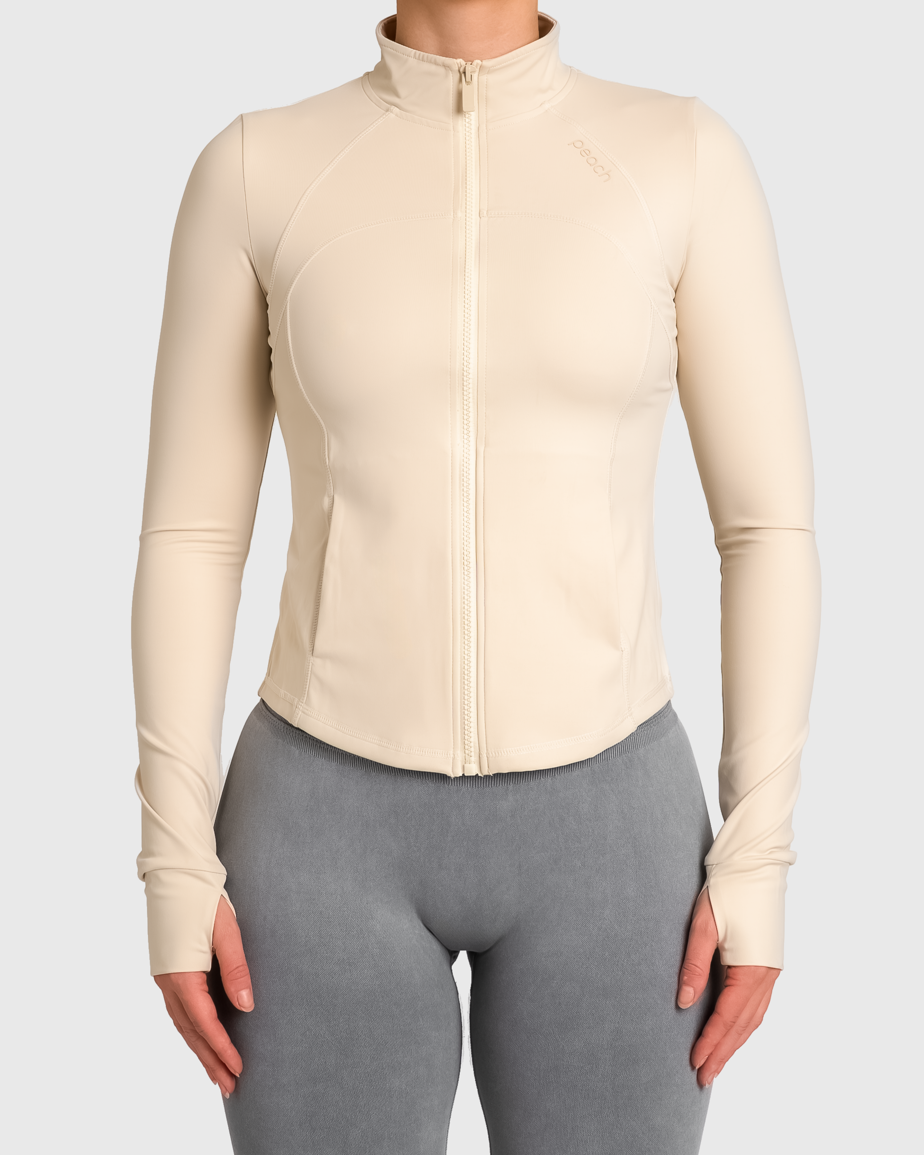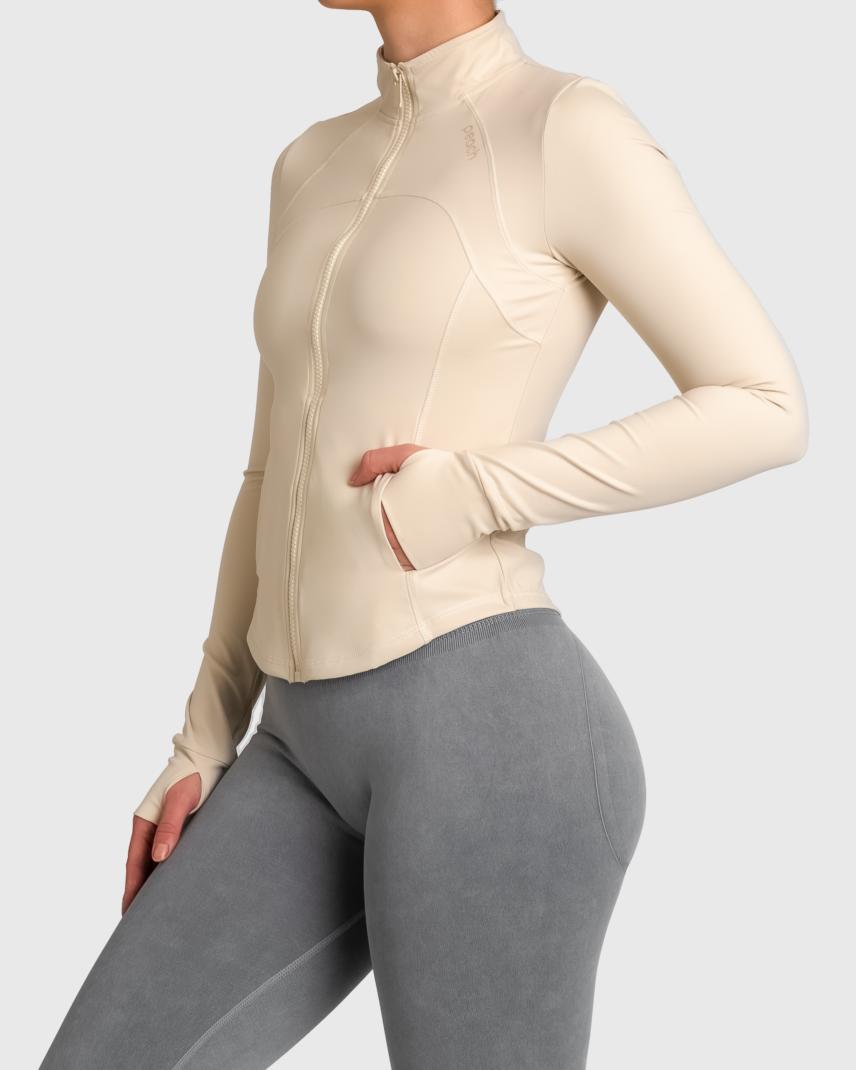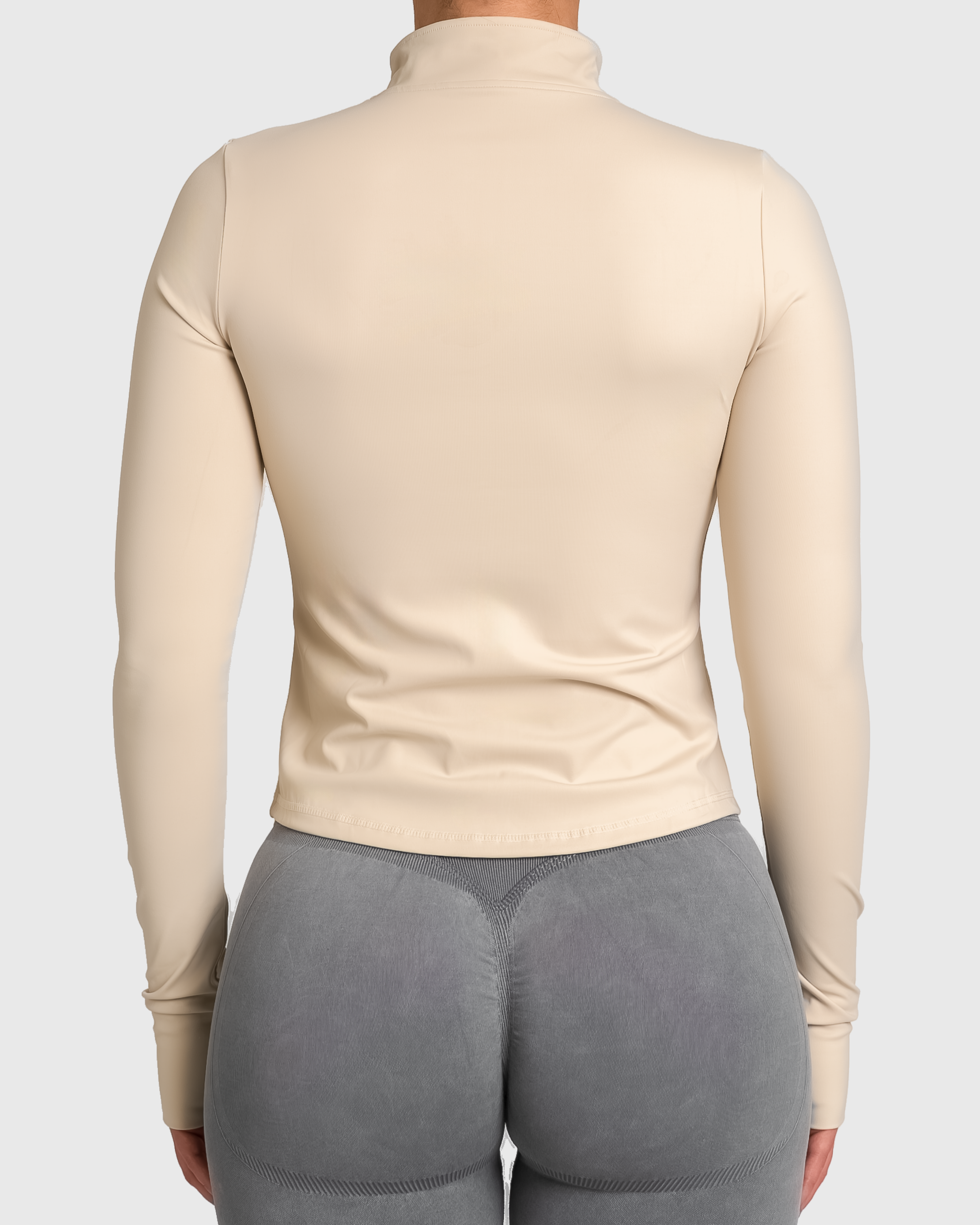 Denne jakken er laget i et luksuriøst, glatt materiale med høy stretch som gir deg full bevegelsesfrihet og en flatterende silhuett. Den sitter tett over skuldre og armer, men faller naturlig rundt midjen – akkurat passe formende, uten å stramme. Perfekt både til trening og til hverdags.